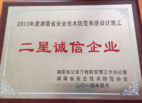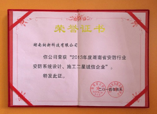 2014年4月,由湖南省安全技術(shù)防范協(xié)會承辦的“湖南省安防行業(yè)誠信企業(yè)評選”活動中,由湖南省公安廳科技處、湖南省安全技術(shù)防范協(xié)會及湖南省公安廳技防管理工作辦公室等專家團,結(jié)合公開網(wǎng)上推薦等方式的綜合評定,“湖南納新科技有限公司”在千余家安防行業(yè)企業(yè)中脫穎而出,榮獲2013年度“湖南省安全技術(shù)防范設(shè)計施工二星誠信企業(yè)”稱號。