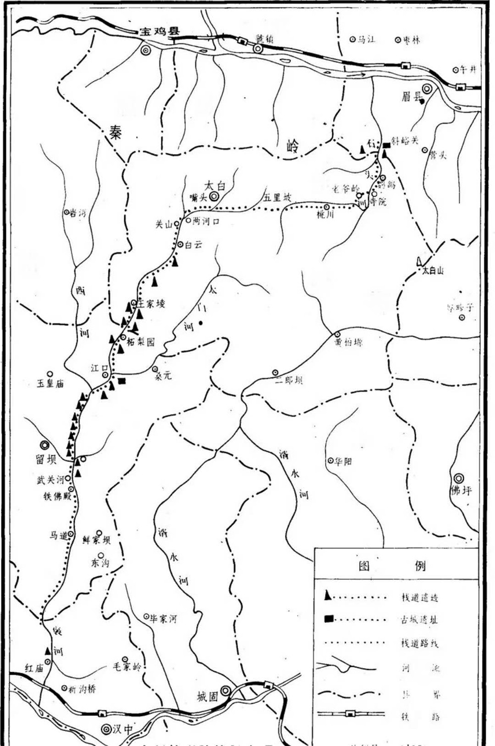 秦漢時(shí)期,褒斜道是首都咸陽(yáng)或長(zhǎng)安通往陜南、四川的主要驛路。其經(jīng)行路線大體為:自長(zhǎng)安經(jīng)戶縣折西過周至、眉縣,西南行由斜谷口入山,沿斜水東側(cè)南行,經(jīng)鸚鵡嘴、下寺灣過斜水,翻老爺嶺(即古八里坂),進(jìn)入斜水中游的桃川谷地,再西過靈丹廟、杜家坪,登五里坡(古稱五里嶺)進(jìn)入褒水上源之一的紅巖河上游(今太白縣城所在地嘴頭鎮(zhèn)),然后折向西南,經(jīng)兩河口、關(guān)山街(即古河池關(guān))、上白云、下白云、古跡街、高橋、王家棱、柘栗園,到褒河上游三源交會(huì)處的西江口鎮(zhèn)(古代附近有三交城),經(jīng)孔雀臺(tái)、下南河、武休潭、馬道鎮(zhèn)、褒姒鋪,穿石門或越七盤嶺出褒谷口,再經(jīng)褒城到達(dá)漢中。